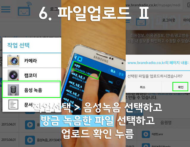 업로드 버튼을 누르면 작업선택란에 음성 녹음이 보입니다.