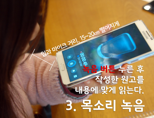 먼저 주위가 조용한지 체크해보고, 작성한 원고를 원하는 목소리 톤으로 녹음해주세요.