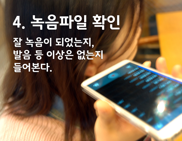 녹음한 목소리를 들어보고 원고에 맞게 잘 녹음되었는지, 소음은 없는지 체크해보세요.